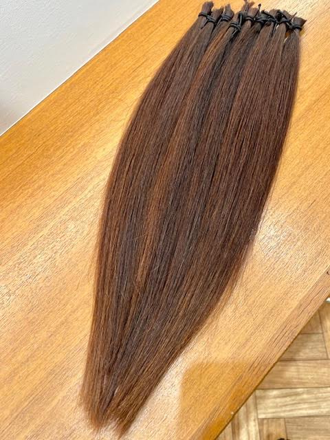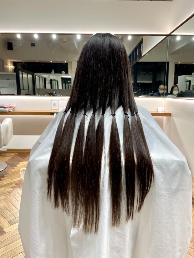コロナ禍で美容院から足が遠のいてしまったこともあり、以前から気になっていた 「ヘアードネーション」をしてみたいと思い立ちました 「31cm以上」というハードルがあり、それを目指してがんばってみました 先月くらいから、診療中にどうにも邪魔になる事が多く、長さも腰に届くくらいだったので、 30年来のお付き合いの美容師さんに、カットしてもらいました